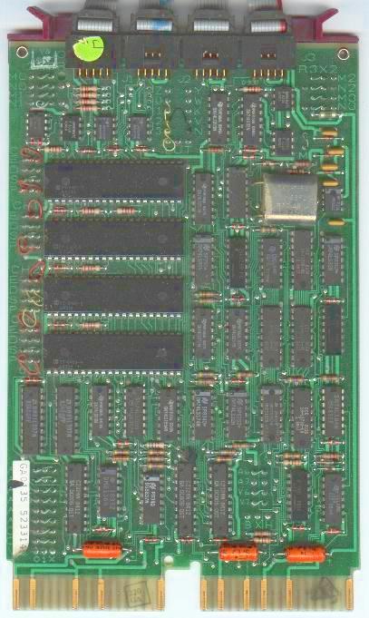 A four-port asynchronous serial line interface. The lines don't have modem control, baud rates are selectable between 150 and 38.400 baud. "Native" interface is EIA, but it can also be used with 20 mA current loop devices using the DLV11-KA adapter.