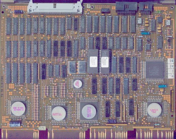 The heart of the module is the CVAX chip, which contains 180.000 transistors and runs at 22 MHz. There are support chips for clock, floating-point accelerator (70 instructions, 32 other are simulated in software), memory management and qbus interfacing. The processor also utilizes 1 Kbyte first-level write-through cache memory (90 ns cycle) and 64 Kbyte second-level cache. The module also includes a system support chip (SSC) which provide console and boot code support, console serial line, interval timer, time-of-year clock, and some other functions. The processor's resident firmware consists of 128 KByte code stored in two 27512 EPROMs. It provides services for self testing, initialization, console command language (CCL), bootstraps.
