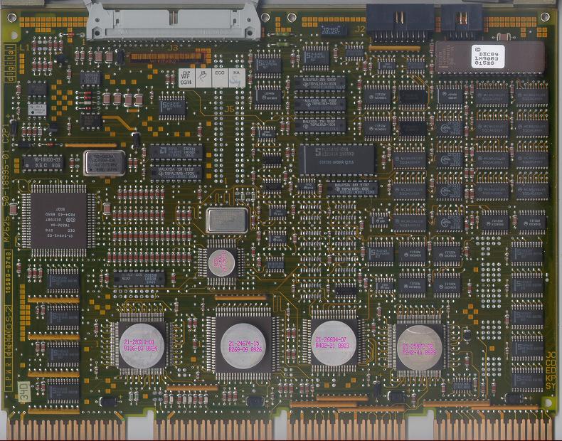 The M7625 KA655-A CPU module was used in MicroVAX 3800 and 3900 systems, while the KA650-B was the heart of the VAXserver 3800 and 3900. The module itself can be seen as an enhanced version of the KA650 CPU. It has a CVAX chip on it, running at 33 MHz (272 hardware instructions, 32 emulated by software, 9 hardware data types, 7 emulated), with an 1KByte L1 cache at 60 ns, and 64 KBytes L2 cache at 120 ns. The memory management works up to 64 MBytes, the system accepts MS650 memory boards (up to four). As it's mostly an upgrade to the KA650, it's normaly housed in the same BA213 boxes (with straight-down Q22/C-D backplane), but it can also be used in the first few Q22/C-D slots of a BA23 or BA123.