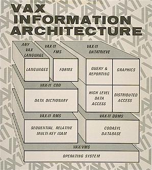 A VAX Information Architecture-t a VMS alatt futó felhasználói programok együttmûködésére tervezték. Ahogy a baloldali képen "látható", a különféle adatbázis-kezelõk, feldolgozó-rendszerek és programnyelvek tömörültek egy jól integrált egésszé. Lényegében minden komponens el tudott érni más kompononenseket megfelelõ függvények hozzáadásával. |