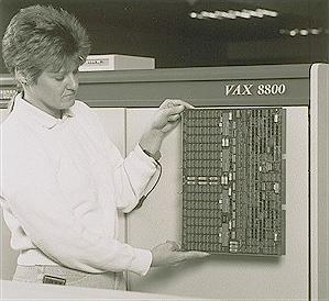 le tudott kezelni több processzort. A 8700-as sorozat egy kisebb teljesítményû változat volt. A baloldali képen az elõtérben egyébként a DEC Professional-alapú konzol látható. Egy 8800-as cluster (8 processzorral, 4 szalagos egységgel, 2 HSC vezérlõvel, a couplerrel és 4 SA482) Egy BI-kártya, csak hogy ilyet is lássunk :-) |