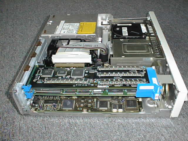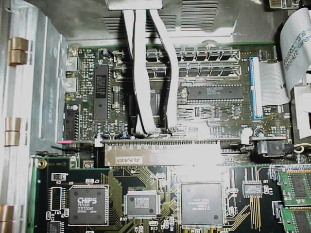 Looking inside, one can see that IBM removed the 50/70's internal hard drive bay and instead placed the ESDI drive into one of the accessable floppy bays, so you can't have two floppies and a hard drive at the same time. Remember the 55SX was designed as a low-end machine, so this compromise was quite acceptable. The power supply is located in the case's rear right corner; a power supply similar to the 50/70 resp. 56 probably was impossible because the drive bays and the card space already occupied too much of the case's width. IBM however found a simple and elegant way to keep the power switch at the front: The real power switch is operated via a piece of steel wire which connects to the lever at the front. So in contrast to other constructions with low-voltage switches and standby supplies or 220V cables running through the machine, the mains voltage never leaves the power supply's case and the machine is really off when you turn it off :-) The ESDI interface is laid out as an 'inverted slot' on the raiser's top edge; a flexible ribbon cable with an edge connector is plugged into it and runs to the hard drive which has the same connector. There were also variants of the 55SX which had a flexprint instead of a ribbon cable, but the connectors remained the same. The 386SX CPU isn't visible in this photo; it is directly next to the coprocessor's socket int the front-left corner and hidden by expansion cards.