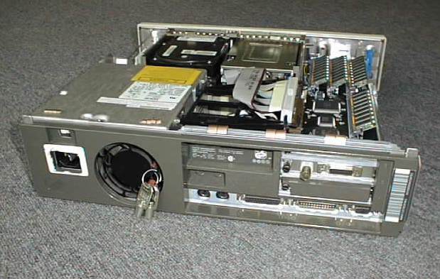 The back side of the 55SX doesn't reveal anything special: keyboard, mouse, parallel and serial port plus the VGA connector. There are also two break-out holes known from the 56 and other PS/2 machines; their purpose is to add a U-shaped piece of steel that is large enough to pull through a chain; this way, you can lock your machine to the table.