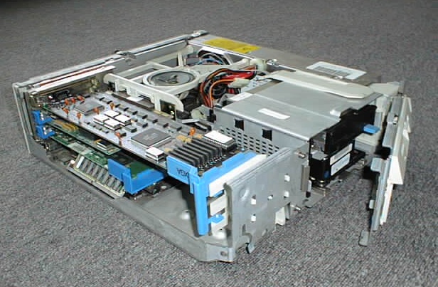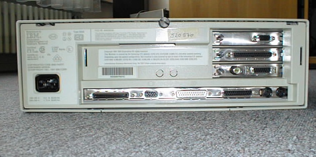 From the left to the right, we have an external SCSI connector (wow, on-board SCSI, however with an IBM-proprietary connector :-/), VGA, one serial and one parallel port, and last but not least keyboard and mouse. The two round break-out holes are provided for adding a U-shaped bolt. This bolt allows you to tie the machine to the table it is standing on via a chain and a lock or something similar.
