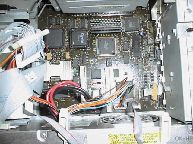 The CPU has to hide itself under a large cooling plate (left edge of the board's visible part). Floppy and internal SCSI connector are pulled off to get a better view onto the board. A little mystery circumvents the two empty sockets for VRAM memory: You can put in another 256K of RAM, and IBM's test program in fact then reports the 512K video memory. I haven't found however any way to exploit the larger video memory, and the usual way to replace the on-board standard VGA was to put in a graphics accelerator into one of the slots (an XGA-1 in this case, the long card in the topmost slot).