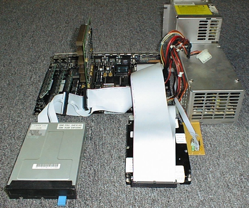 ![]() Click here or click onto the photo for a full size version of this picture. err...ahem...um...yes. I was a bit too late at the junkyard and the computer was already torn into pieces when I showed up. I was only able to rescue the power supply and PCBs :-( When I said that the SLC2 was IBM's last step in the development of the 56/57, this was actually only halfway true. It's true when you only count the CPUs with a 386SX-style pinout. The processor used in the SLC3 actually is a DLC3, i.e. a processor with a 386DX-pinout which is here only used with a 16-bit data bus. IBM simply took the planar of the SLC2 and redesigned the the part around the CPU for the DLC3. Needless to say, the performance gain is limited because only things that are small enough to fit into the 16K cache will run faster by 50%, the bus interface is still as slow as a good-old 386SX. This variant may be regarded as an afterthought of the 56/57 model line, and this one is the only machine of this type I have seen so far.