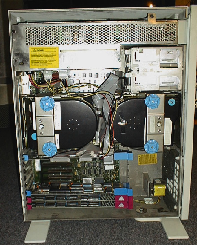 Since there are much longer distances to bridge in a tower than a desktop case, IBM wasn't able to build the 60 as cableless as the 50. But they made the best of the situation: Though the floppies are connected via a (short) cable, the edge connectors are held in a special plastic frame behind the drive bays so you simply push the drives into the 'slots'. Mounting large hard drives is also done without screws - pardon, given there are already special rails applied on both sides. You have to admit the blue knobs are unique....