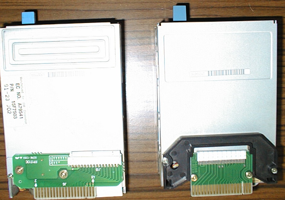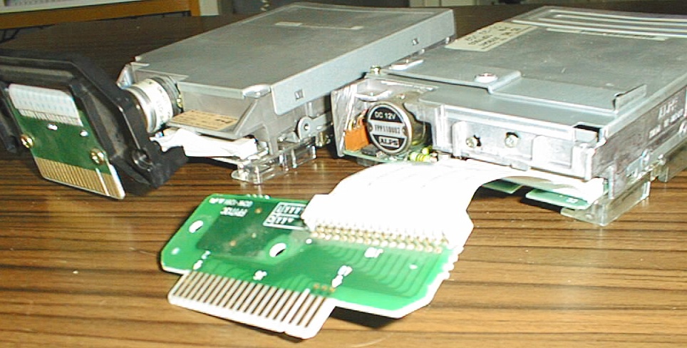 Originally, the Models 50 and 70 used floppy drives of full height (1.6 inch). But these came quickly out of fashion and adapters were thought out to put standard 1-inch drives into the same drive bays. The solution was to screw additional adapter PCBs onto the drives that provide the 'standard' 40-pin edge connector. On the other end...