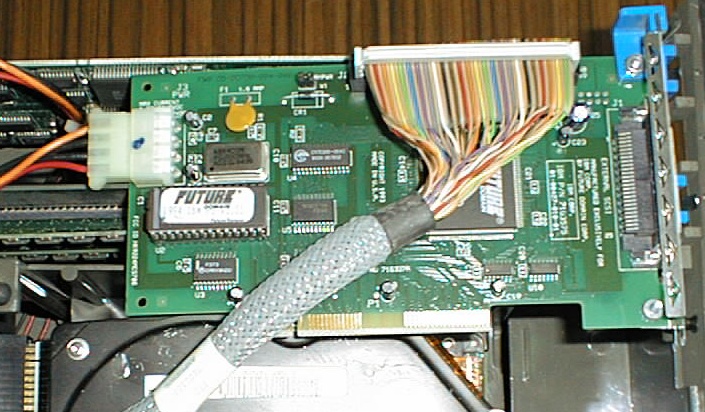 Basically, you can choose any SCSI controller you want. Common choices are the IBM SCSI controllers, the Adaptec 1640, and some other third-party controllers e.g. from Future Domain and Trantor. In this case, I used the IBM Fast SCSI Adapter/A, which is effectively a Future Domain MCS-700 with a BIOS slightly adapted for IBM. It is capable of Fast SCSI (10MHz) transfers, offers an active termination and is only half length. Another plus is the standard-compliant external connector, which is in contrast to the IBM controllers with their Mini-Centronics connectors and cables not below 100 DEM in Germany. A real benefit for our application is that it offers a power connector for a drive; if you have the IBM OEM variant of the controller, the connector is probably not populated. Adding it is however not too difficult if you know how to hold a soldering iron; apart from the connector, only 4 capacitors have to be added. The IBM variant is commonly found in later Model 76/77 (the so-called 'Lacuna' planars), and since these have an on-board IDE interface, it might be unused. The cable used here is the cable IBM shipped with a 76i. It is a high-quality cable with the wires twisted pairwise, but a standard ribbon cable would probably work fine either.
