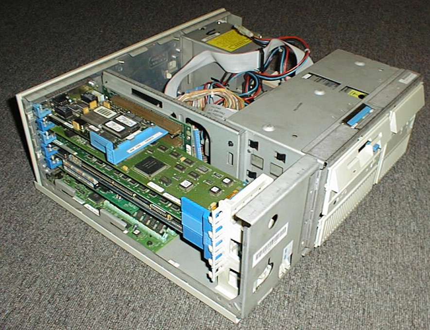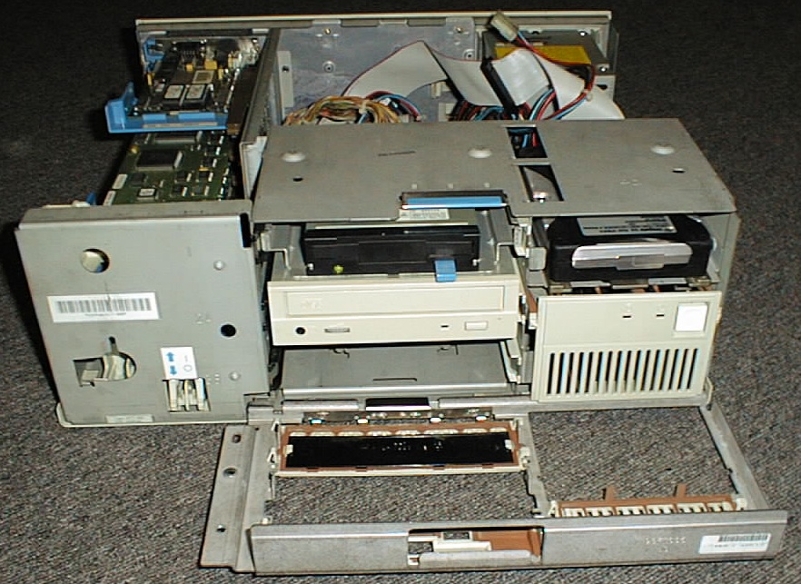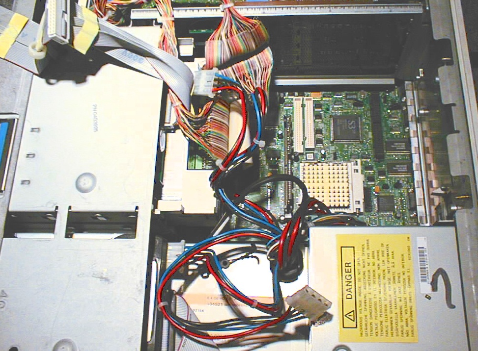 ![]() Click here or click onto the photo for a full size version of this picture. The Model 77i/s is the 'big brother' of the Model 76i/s: it shares the same main board, but has a larger case and bigger power supply, providing space for up to 5 full-length MCA cards and 4 drives. One of these bays is usually occupied with the floppy, so there is effectively room for two 5,25 drives and one 3,5 inch drive. The space below the latter one is not unused; the power supply extends almost to the front :-)