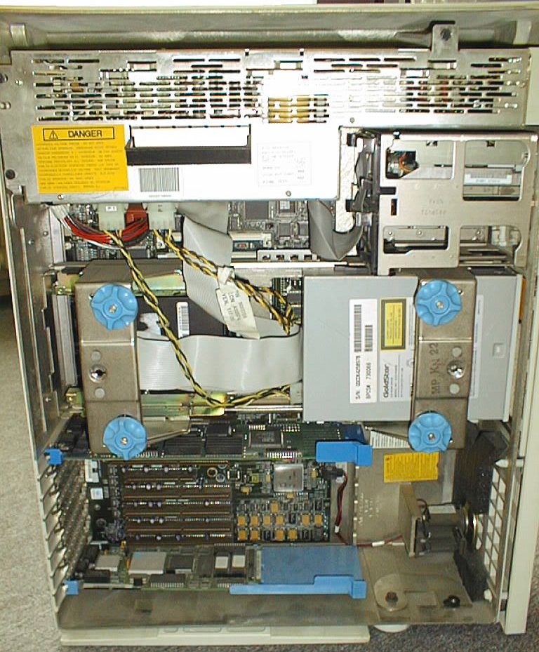 A look into the machine doesn't show many differences compared to an original Model 80, the case just looks a lot 'emptier': The large, 5,25-inch full height disks are gone, a small 3,5-inch IDE drive now has more capacity then the largest of the ESDI monsters IBM offered. You need an additional adapter frame to hold the small drive in place...the battery holder is also empty, the battery was moved onto the planar, just like in the later IBM PS/2 models.