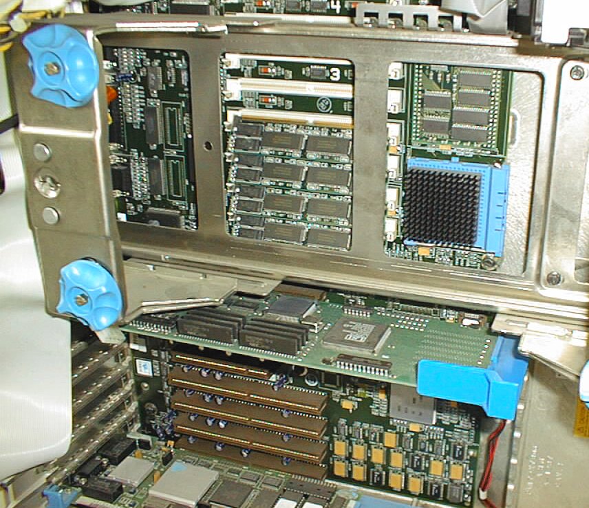 Gone are also the raiser-styled memory modules that were unique even in the PS/2 line. The planar uses standard 72-pin SIMM modules and can take up to 8 of them. 8-MByte modules are known to work, so you can stuff in at least 64 MBytes, but it is possible that even larger modules work. The CPU itself is placed in a ZIF socket for easy upgrade. 5V-based models are simple, DX4 CPUs probably need a voltage regulating interposer.