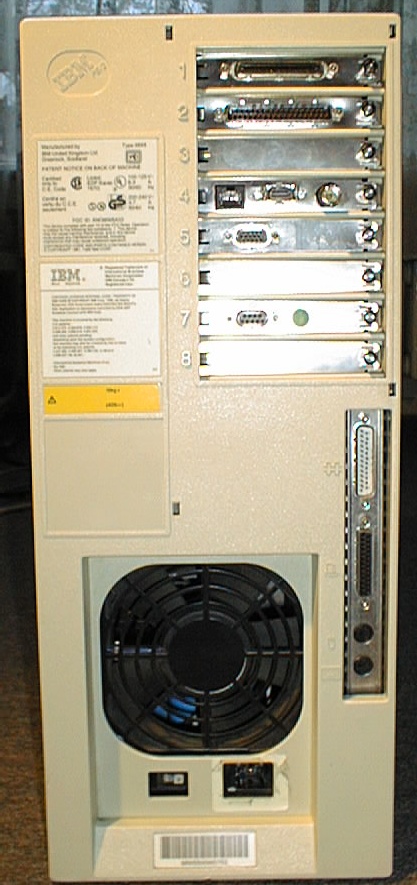 The planar board offers space for 8 full-length 32-bit MCA cards. The 8595 models use an earlier version of the planar that only offers one serial and one parallel port (later ones had two of each). Really impressive ist the fan of the 400W power supply which is in best tradition of the Model 60/80's giant fan - when you hear that IBM always constructs machines for a minimum lifetime of 10 years, you really believe it when you see this....