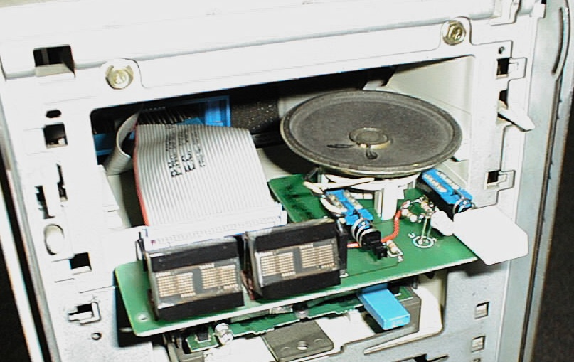 This is a detail photo of the operator panel. The additional second pushbutton is an artifact since this panel was originally constructed for a different IBM machine - it has no meaning for the 95, but it comes in handy when the power switch breaks and you need a replacement. This photo also shows the modification that replaces the green power LED with a Duo LED that blinks red during disk accesses. The circuitry is simple since the HD access signal is already present on the board. The modification is described in detail on the page mentioned on the right side of this page.