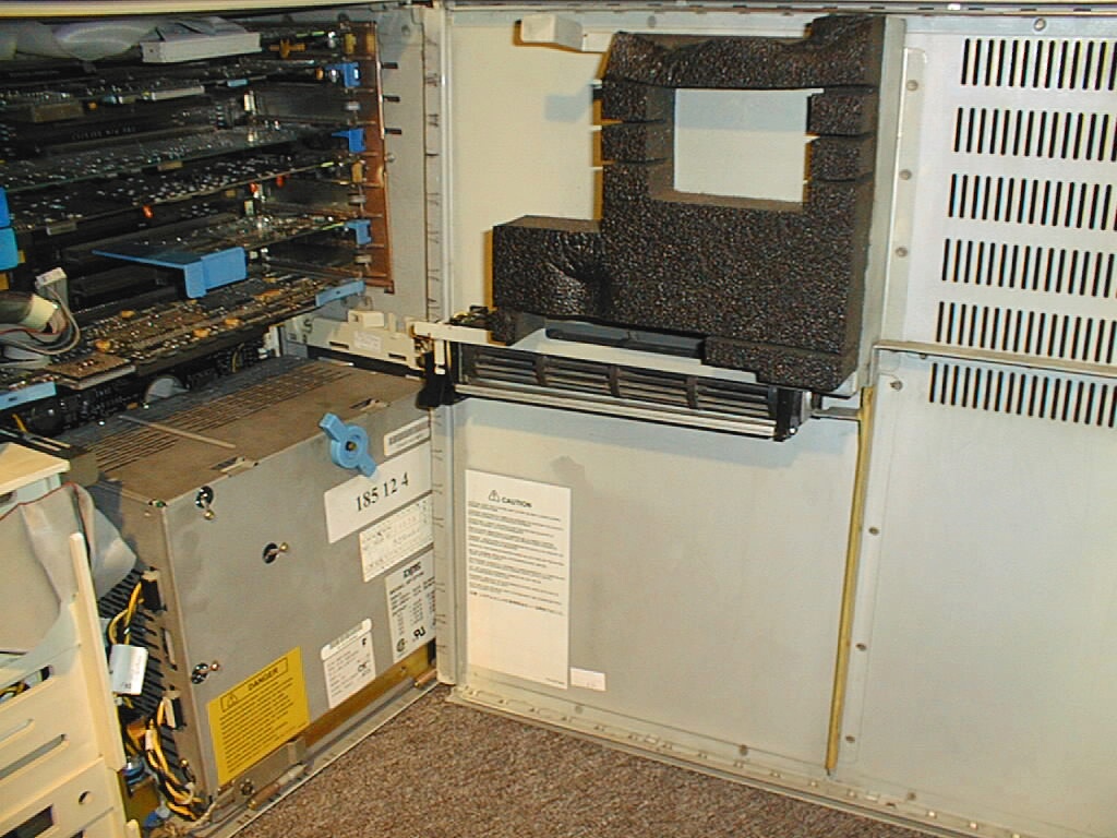 If you also have to deal with standard PCs, you probably also know the problems linked with the so-called 'CPU fans' - those tiny fans screwed onto the CPU's heat sink to fix the thermal problems of a misdesigned Noname case and which get stuck twice a year. The 95 uses a large radial fan in a side cover. It is directly targeted at the processor board and allows to run the original 486DX33 CPU without any heatsink! I now have a DX2-66 in the machine and a small passive cooler is sufficient to avoid any heatup :-) By the way, the side fan is the reason why one should't run the machine for more than a few minutes with the cover removed.