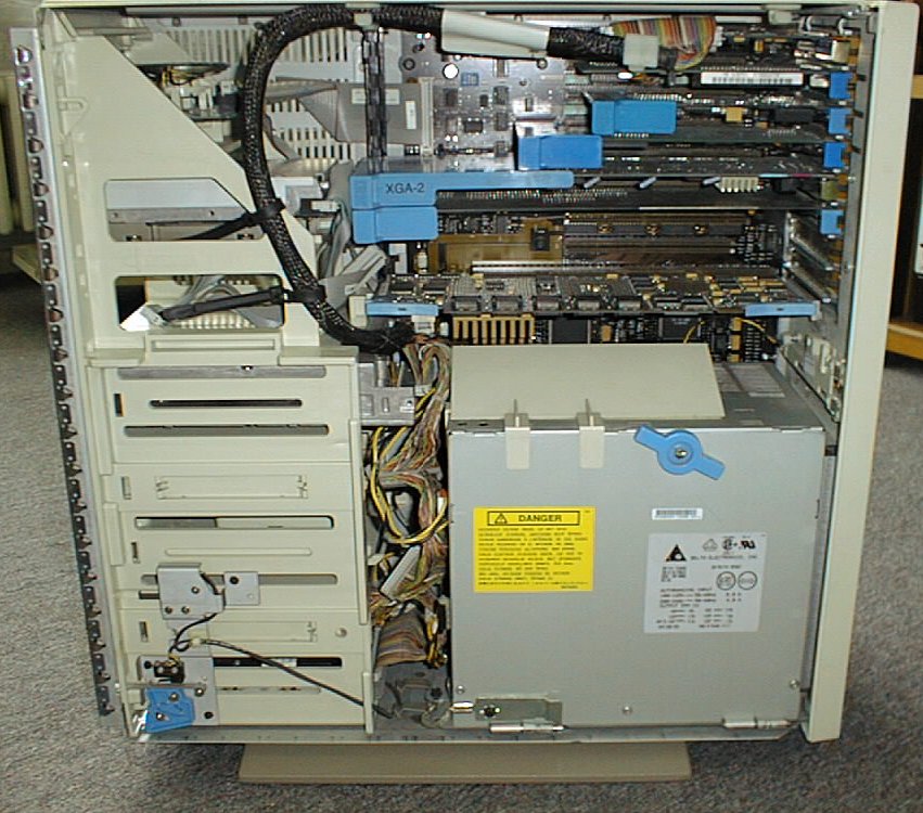 A machine designed for a Pentium-based complex can quickly be identified by the additional plastic airflow director placed on the power supply. Especially the 60/66 MHz version of the Pentium produces a lot of heat, and this part is needed to direct the airflow made by the fan in the side cover towards the processor's heatsink. You therefore shouldn't operate this machine too long with the cover open! As usual, the power supply may be swung out to get access to the memory module sockets. 8 sockets may take up to 8 MByte Parity or 32 MByte ECC modules.