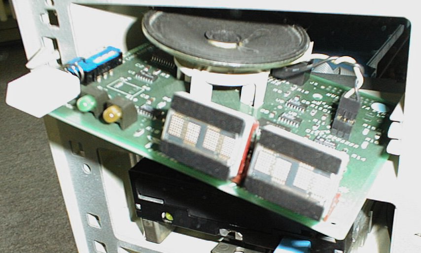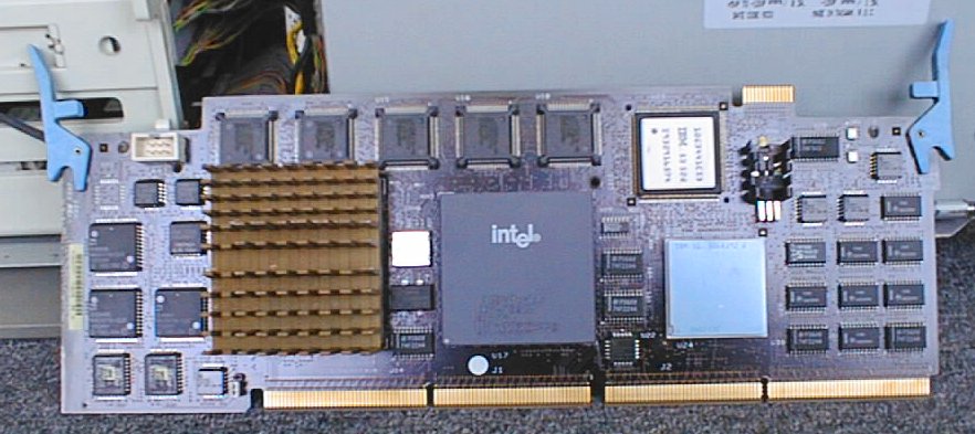 The CPU board is dominated by 2 Intel chips, the CPU (hidden below a heatsink) and the Intel 496 cache controller. The row of smaller chips on the PCB's top edge are the cache RAMs, another set is on the back side. Sadly to say, the 496 cache controller is the reason why you can't use the 120/133 MHz overdrive chip later offered by Intel: It internally uses a P54C core with a 5->3.3V regulator, and its signals only have 3.3V logic levels. The 496 is not 3.3V-compliant! There were some attempts with the 497, its successor for 3.3V-based Pentiums, but they have not resulted in very stable systems so far :-( The blue chip in the right half is the Synchrostream controller.