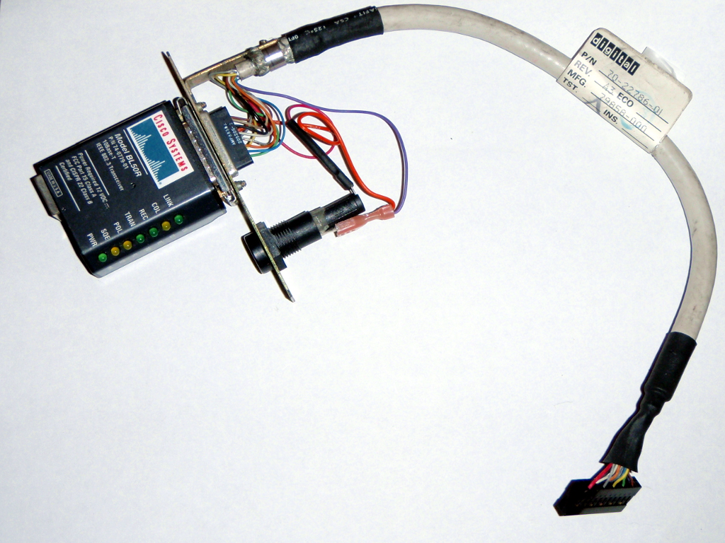 The DEQNA and DELQA both require a cable to bring the interface out to a 15-pin AUI connector. I fitted a Cisco BL-50R 10Base-T transceiver to the AUI port of my cable, so I could connect it to the network. I chose this transceiver, due to past experience with it, and its extensive number of diagnostic LEDs. The cable and transceiver are shown below.