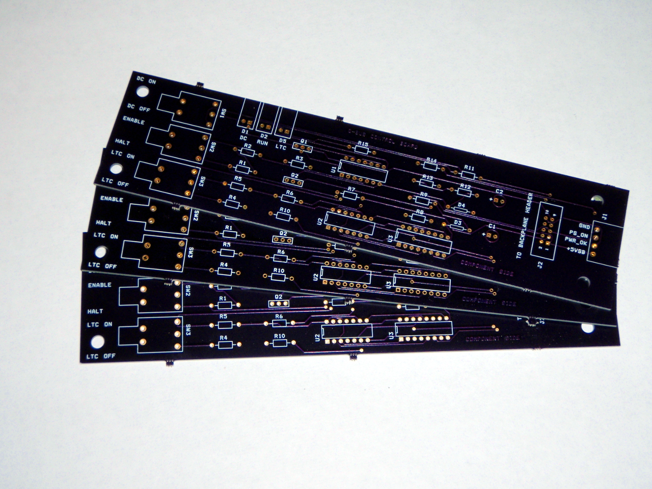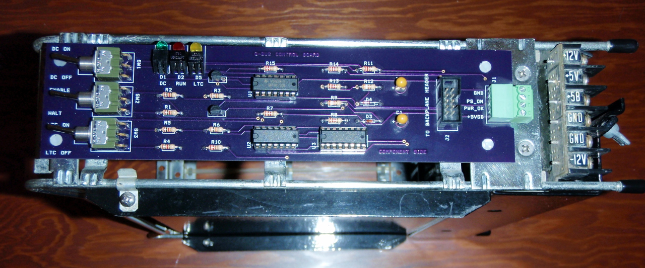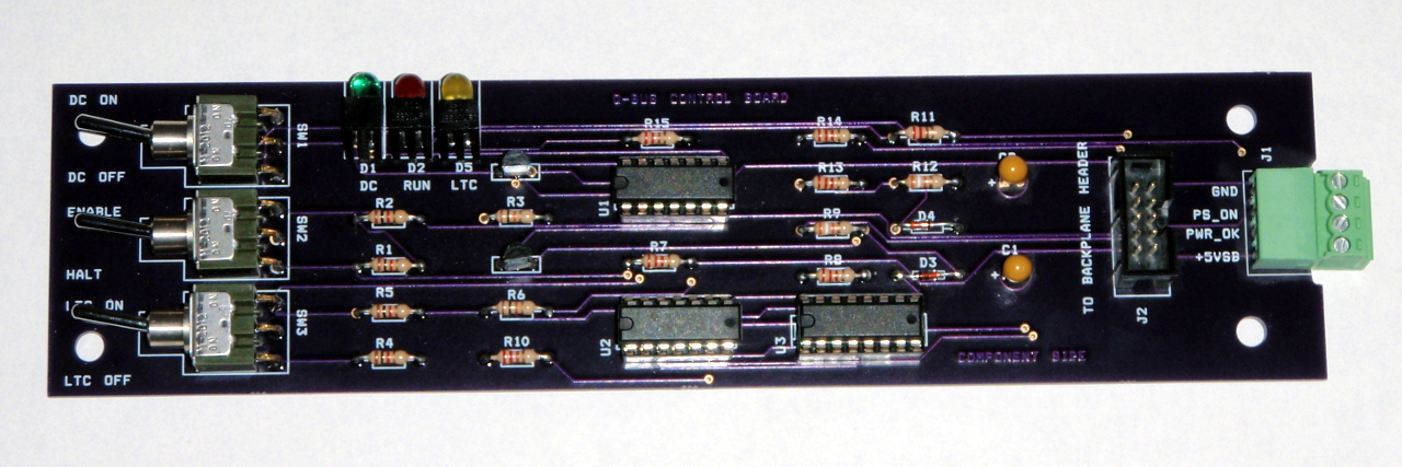 The PDP-11 processor requires a particular power up/power down sequence in order to properly startup and shutdown. The BDCOK H signal is supposed to be activated 3ms, or more, after the voltages reach their normal levels, then BPOK H is supposed to go active 70ms, or more after BDCOK H in order for the processor to initialize. The system also needs a power switch, a enable/halt switch and a line-time clock (LTC) enable/disable switch in order to properly function. Power, Run and LTC LEDs are also nice to have, for troubleshooting purposes. Therefore, a fair amount of additional support circuitry is required for normal system use.