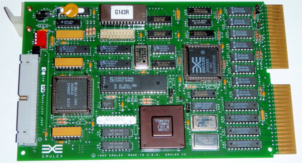 After considering all of the options, including building a custom controller, the best scenario I could come up with was a SCSI controller. For this, I chose an Emulex UC07 fast, narrow, high voltage SCSI model, which was the most common, best documented and least expensive I could find. It was also listed in the hardware compatibility list for 2.11BSD.