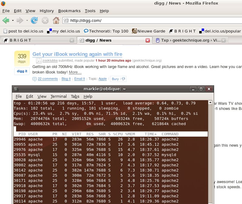 Well, luckily I’ve been doing some reconfigurations to my server a couple of days ago and I guess I finally hit the sweetspot. This isn’t the first time my server is handling a lot of traffic but I don’t think she has ever run this smooth, while in the middle of a frontpage of digg.com (at the time of writing)... yay!