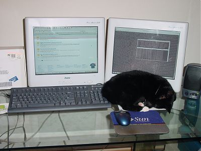 that’s my encrypted fileserver, a SUN Ultra 1 Enterprise with quad 100mbit NIC (quad happy meal) on top (the dual bridge) and the Cisco 2610 on top of that. The Cisco is parked this way because there’s a fan underneath. On top of the Cisco is a small LCD-screen I bought on a fair for 25 euro, it comes with a designated PCI-card which also feeds the screen, probably useless for anything else than a console… (it’s a console to my fileserver btw)