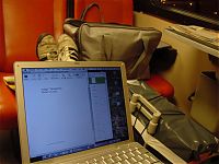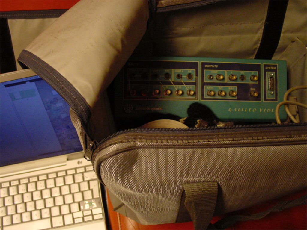 The machine is an SGI Indigo2 and yes, that’s the Owner’s Guide I’m reading there on my powerbook (in the train)... (and oh, that bag is a bag designed to carry Compact Macs)