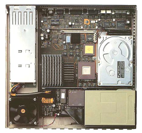On the interior it's also clean and minimal. Starting from the top of this image down are the rear ports and power supply, the memory, LSI chip, and HD, and the fan, CPU and floppy drive. On my personal machine, the CPU has a heatsink, I see on this image that it doesn't have one. Curious.