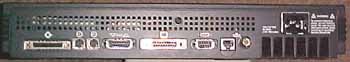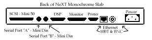 Looking at the back of the slab, it's apparent how much is shared between the monitor and the main unit - in fact, the monitor doesn't even have it's own power connection -- again, everything is carried through the DB19 connector. The keyboard connects to the monitor, the monitor to the computer, and the power switch is on the keyboard!