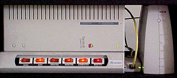 Motorola made these machines a little different from regular Macs, for one thing, they use very standard PC parts like the powersupply and the case dimensions. Also, while it has the ADB for Mac keyboards and mice, is also has ports for PC keyboards and mice. Cool, eh? And speaking of cool, note the addition of the 5.25 "fan bay" in the center, keeping the machine cool, as it runs all the time, calculating SETI@home work units, when I'm not using it.