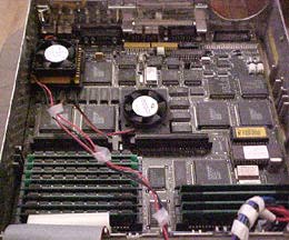 The other hack to the IPC is the chip fans. Since I'd be running this machine all the time in a hot machine room and have an internal HD, I wanted to get the maximum airflow. Removing the floppy drive was the first step, as I didn't need it and it was otherwise taking up room and generating heat. Then I placed a chip fan and heatsink from a PC (a 486), and sandwiched the whole affair onto the Weitek FPU, on the rear left of the motherboard. The Weitek is smaller than a 486, but the proximity of the plastic side of the case allowed me to wedge the heatsink's plastic bracket properly into place. The second chipfan is another 486 leftover, this one is just sort of sitting in the center of the motherboard, moving air around -- because the recommended airflow is to suck air in from the sides, the center of the board is theoretically where it's the hottest.