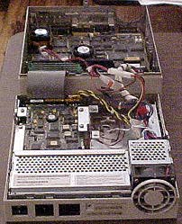Here's a shot of the whole affair opened, so you can see how the pieces all fit together. The drive bay(s) and power supply are the top half of the case, while the motherboard and any cards it might have are in the lower half of the case. From here you can see the ram slots, the "two fan hack" and all my extra wiring to run it all.