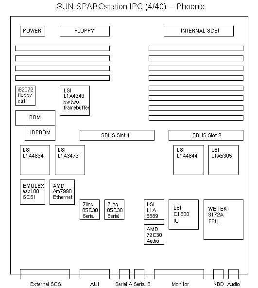SPARCstation IPC (4/40) Processor(s): MB86901A or LSI L64801 @ 25MHz, 13.8 SPECint92, 11.1 SPECfp92, 327 SPECintRate92, 263 SPECfpRate92 CPU: 501-1689/1690/1835 Chassis type: lunchbox Bus: SBus, 2 slots Memory: 48M physical; 64K write-through cache, direct-mapped, virtually indexed, virtually tagged, 16-byte lines Architecture: sun4c Notes: Code name "Phoenix". 1M or 4M x 9 30-pin 80ns SIMMs. Onboard mono frame buffer. 1.44M 3.5" floppy.