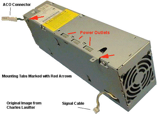 Rotate the cover plate so the downward part enters the recess first. Ensure that the locking tabs are in the slots. Push the cover forward until the cover plate mounting screw can be inserted. Fasten the cover down with a screw. When you rotate the cover, you may not be able to slide it far enough for the mounting screw hole in the plate to match up with the tapped hole in the power supply. Take a file and remove enough of the metal from the downward length on the side towards the exhaust end of the power supply. It is marked "X" in the illustration. You don't need to remove much. Main PS and Additional PS 220W Power Supply Unmasked! Primary Power Supply Voltages