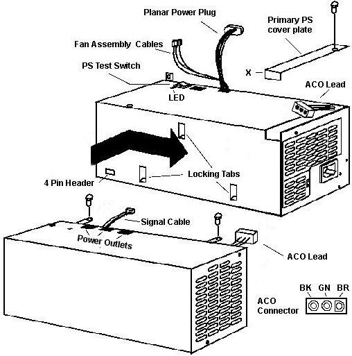 Remove the primary power supply cover plate retaining screw. Push the cover plate inwards until it stops (about 3/8 of an inch). Pull up on the edge now overhanging the side of the power supply. Note the tab and slot locking arrangement. Pull the ACO connector out of the power supply. It won't