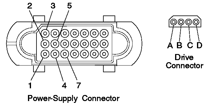 _________________ __________________ _________________ _________________ | -Lead Pin | +Lead Pin | V dc Minimum | V dc Maximum | |_________________|__________________|_________________|_________________| | 2 | 1 | +11.5 | +12.6 | |_________________|__________________|_________________|_________________| Optional Power Supply Drive Connector Voltages _________________ __________________ _________________ _________________ | -Lead Pin | +Lead Pin | V dc Minimum | V dc Maximum | |_________________|__________________|_________________|_________________| | B | D | + 3.7 | + 6.2 | | B | A | + 9.0 | +15.0 | |_________________|__________________|_________________|_________________|If the power supply shuts down, or appears to fail at power-on, you might have one of the following problems: