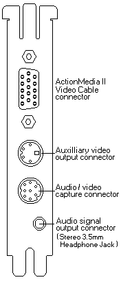 The Audio Signal output connector is a 3.5mm standard stereo jack output connector. An amplifier, or active speakers can be attached to the ActionMedia II Display Adapter/A. The input impedance of the headphones or speakers should be at least 600 Ohms to match the output impedance. Use of a lower impedance devices may cause a POST error and a reduction in audio quality. If you are going to use sound, a stereo amplifier or self-amplified stereo device that can accept standard LINE-level audio output (0-2.0 Vp-p.) from the Delivery Board. The audio device must have an input impedance level of approximately 10 KOhms or greater. Headphones are generally low-impedance devices. To use headphones, plug them into an audio amplifier rather than directly into the Delivery Board socket. Auxiliary Video Output Connector The Auxiliary Video Output Connector (4-way DIN) allows connecting an ActionMedia II Adapter to an S-VHS (also referred to as Y-C) video recorder or similar device. NOTE: A cable is not supplied with the option. ![]()