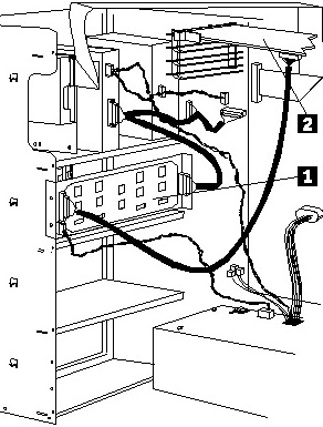 Cable routing in a disk-array model with a new backplane installed in bank D 1. A DASD status cable 2 connects the adapter to the backplane. Notes:
