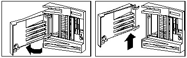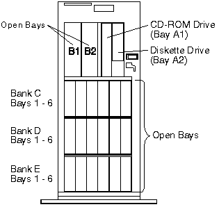 Insert Drive into Bay B1 ![]() Extra Power Supply Required Before installing drives in bank D, you must install an additional 220-watt power supply. Server 500 Bay Locations ![]() Internal drives are installed in bays. A diskette drive and a CD-ROM drive are preinstalled in bay A in all models. A removable CD storage compartment is shipped in bay B1. You can install two drives in bay B. You can install hot-swappable hard disk drives in banks C, D, and E only. Banks C, D, and E each contain six bays. Banks C, D, and E support hot-swappable drives only. You do not have to turn off the server to install hot-swappable drives in bank D. However, you must turn off the server when performing the steps that involve installing or removing backplanes, cables, the fan assembly, and adapters. Bank C supports up to six drives. However, the total number of SCSI drives that you can install in bay B and bank C is six. The number of preinstalled hard disk drives in bank C varies according to the model you purchased. You can install up to six drives in bank D and up to six drives in bank E. Note: The bank letter-designations
