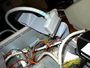 Left you see the VS3100 with the Unisys drive on top of it, and to the right of the drive you see the external SCSI cable connected to the centronix connector my friend added to the cable. A detail is seen on the second picture.